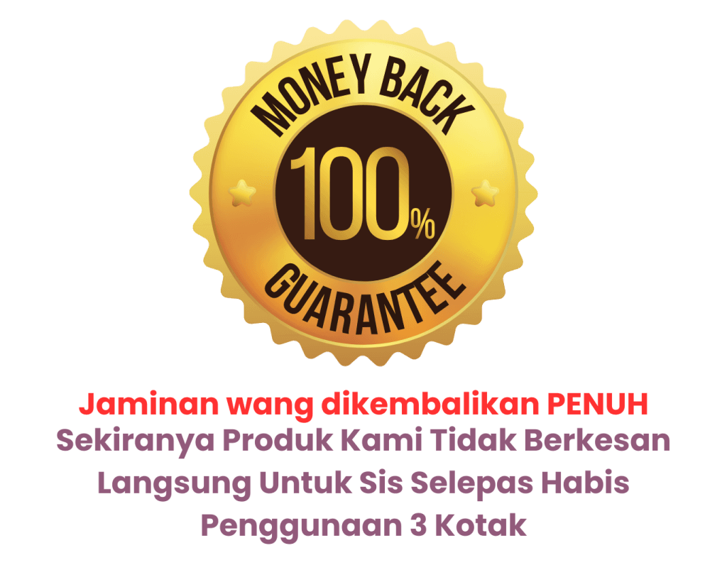 KETIGA: Kami bantu sis sehingga sis berjaya capai hasil yang sis idamkan dengan penggunaan konsisten 2-3 kotak.Sekiranya produk kami tak berjaya bantu, kami akan bagi JAMINAN WANG DIKEMBALIKAN PENUH
