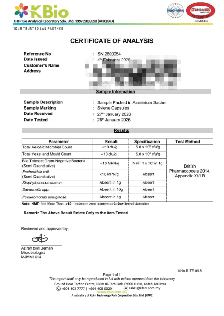 Sylene selamat untuk diamalkan kerana ia 100% herba dan mempunyai Lab Test